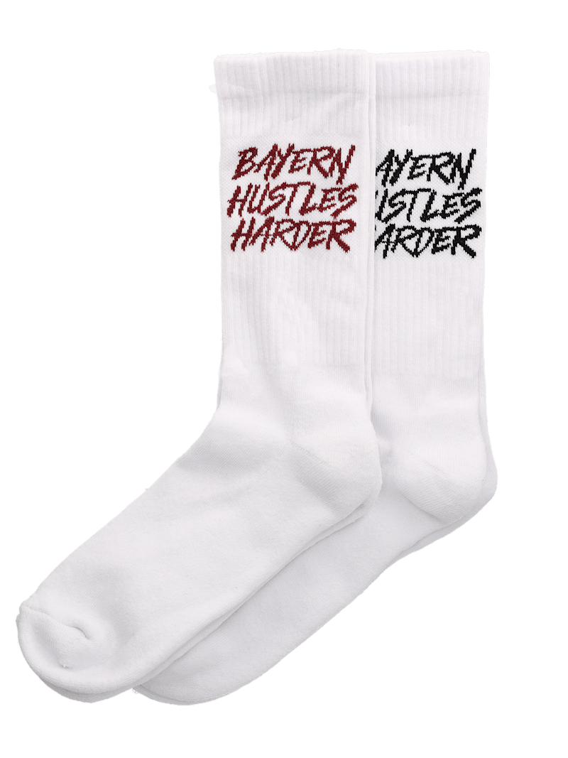 Socken 2er Set Hustles Harder in Weiß überzeugt durch seine Details & ist das Highlight für treue FC Bayern München Fans.